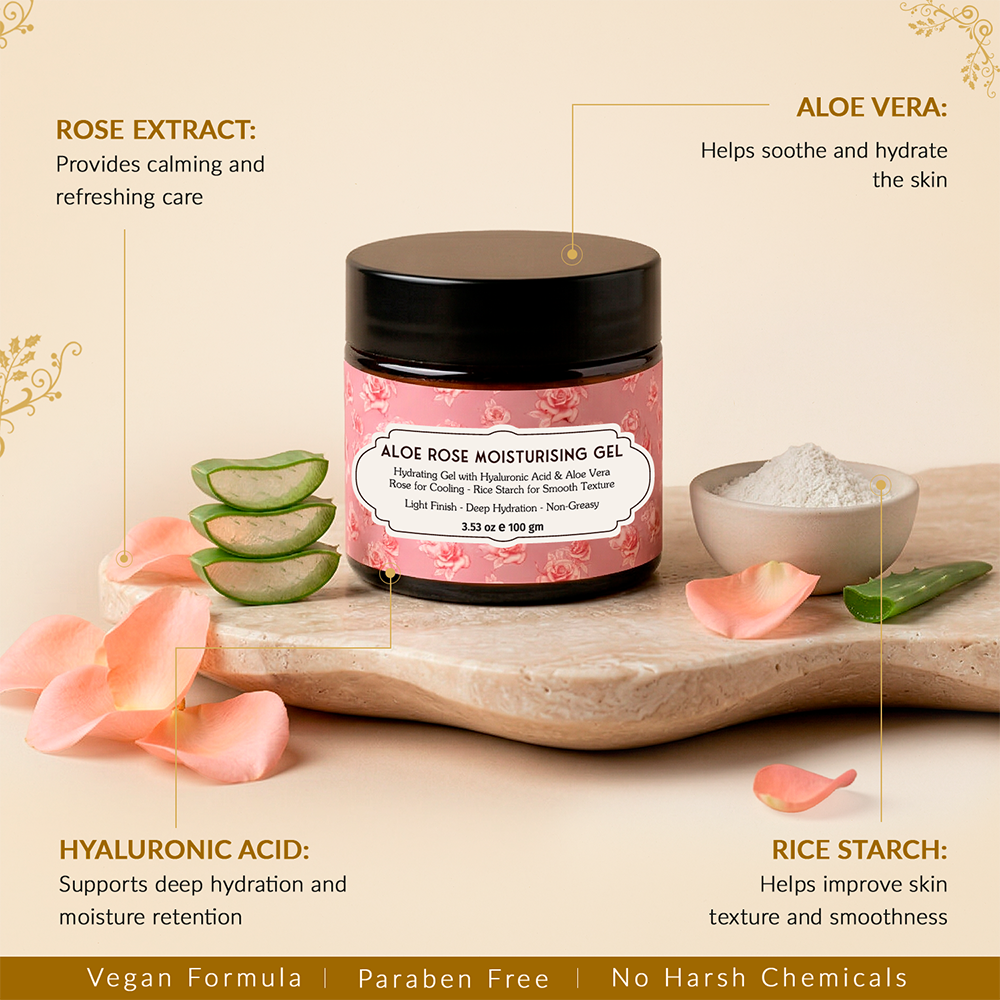 The Aloe Rose Gel is incredibly calming on my skin. It absorbs quickly, reduces redness, and leaves a fresh, hydrated feel. The rose scent is gentle and natural perfect for daily use!